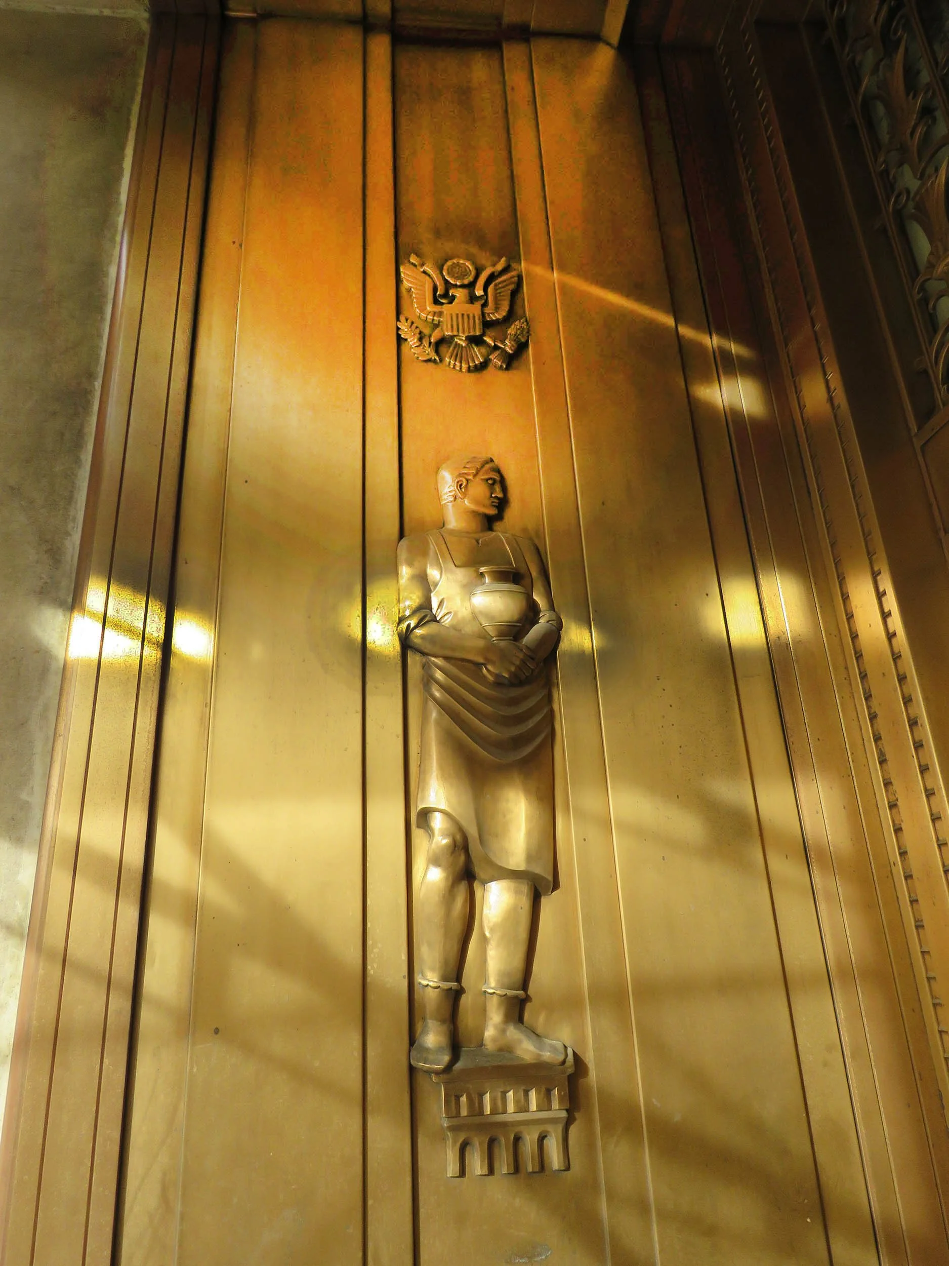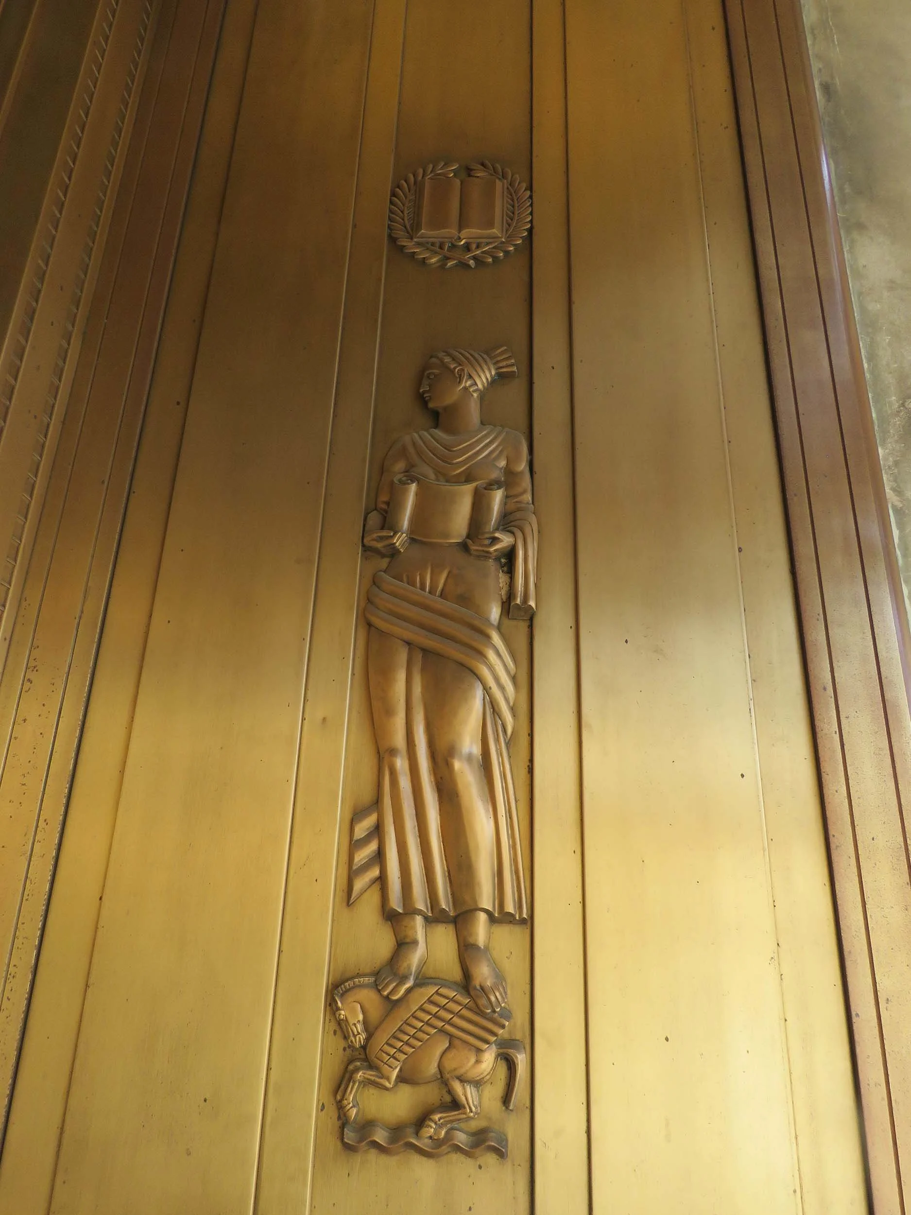 Seven pairs of bronze doors have been added to the Library of Congress Annex. They fill an equal number of entrances to the new building, each approximately 10 feet high by 6 feet wide. Three on the west and three on the east side of the main white marble structure pay homage to the legendary inventors of the several alphabets employed in the art of writing, and one on the south end allocated to the copyright office is ornamented with the seal of the United States. The seal of the Library, a human figure, symbolizing, physical labor, and a similar figure, typifying, intellectual labor – the former man, the latter, a woman.